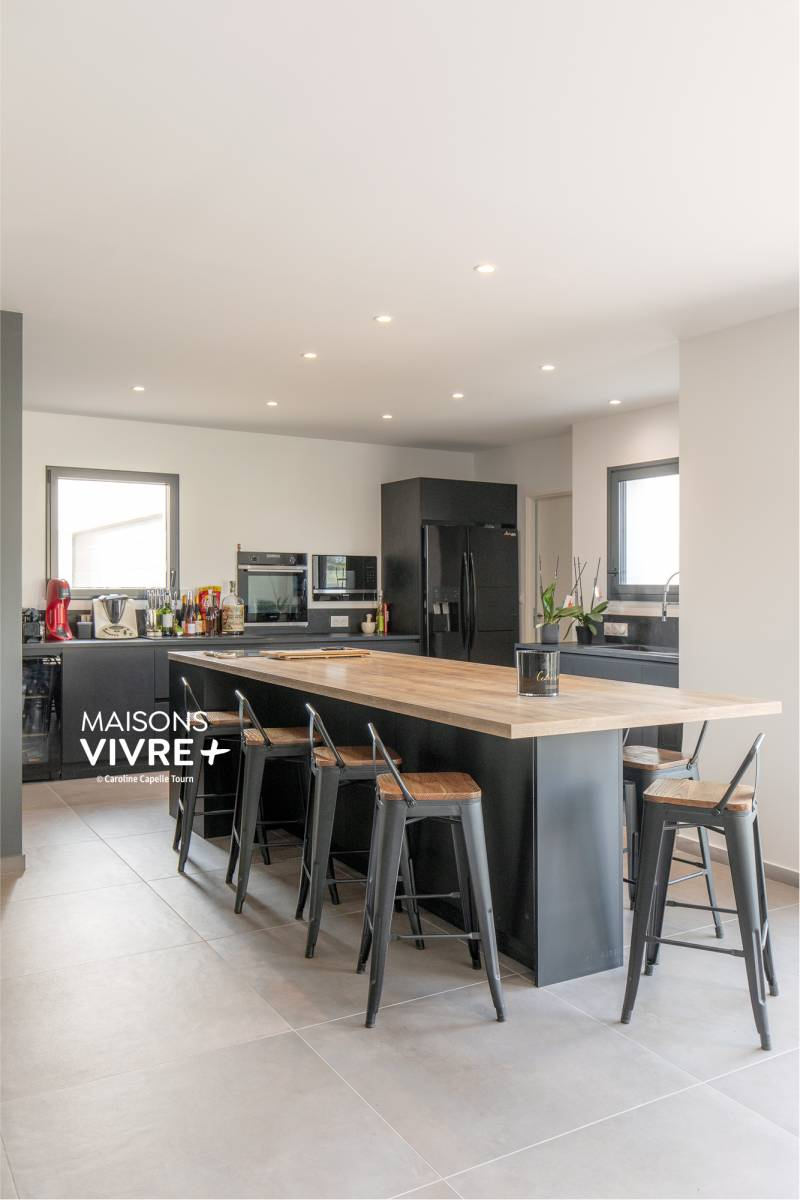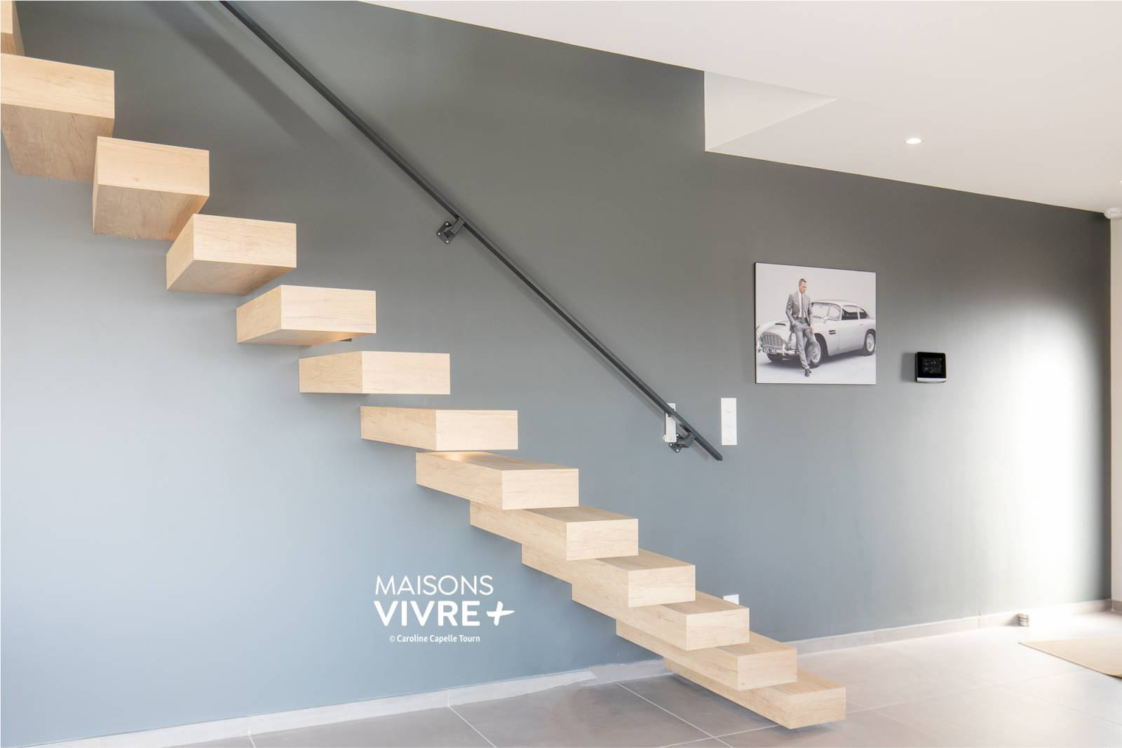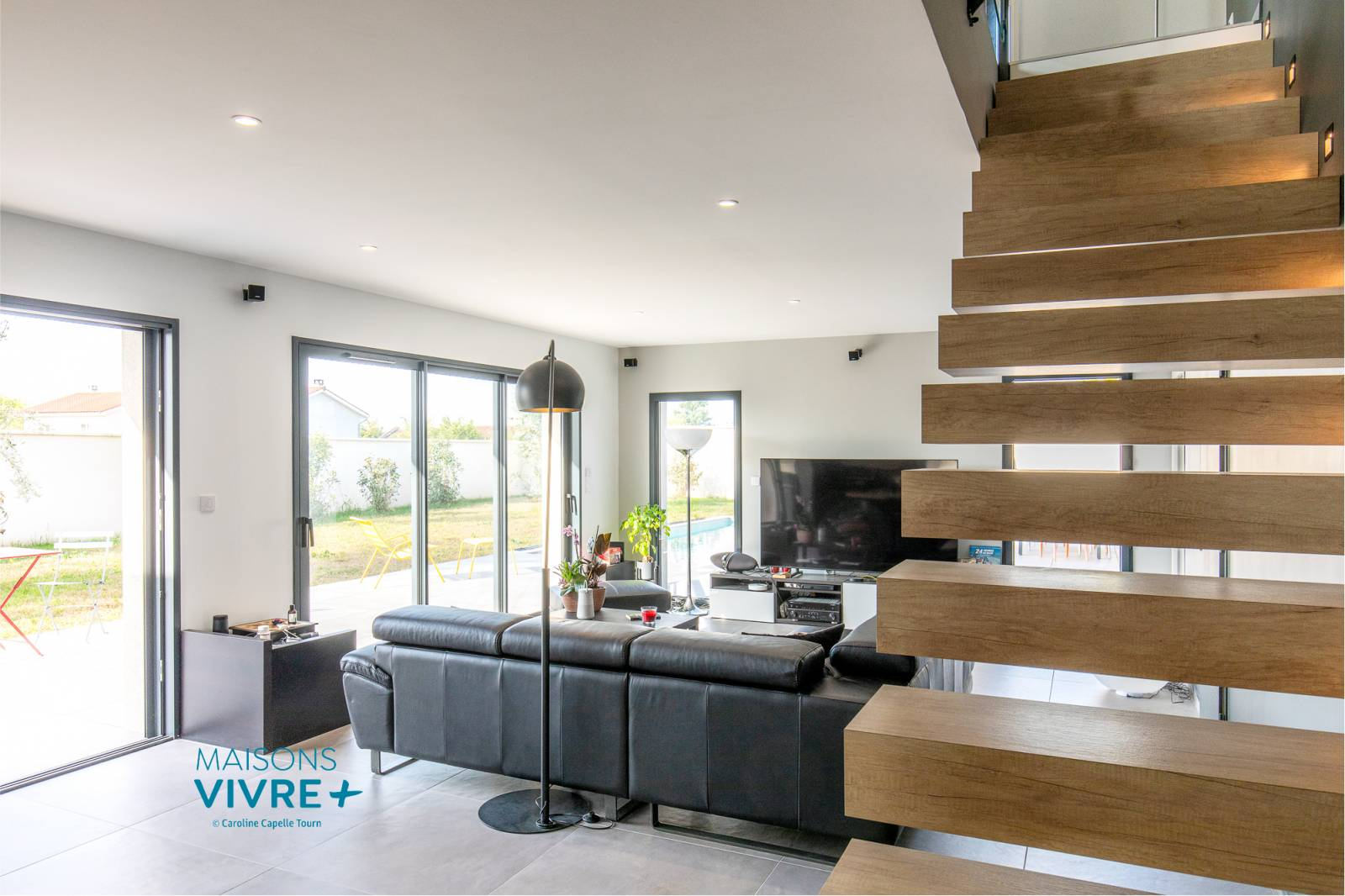A l’intérieur, le bois est mis en avant. D’abord par l’escalier ultra contemporain, qui parait flotter dans le séjour. Egalement dans la cuisine, par un maxi ilot central.