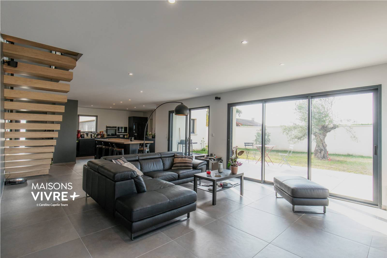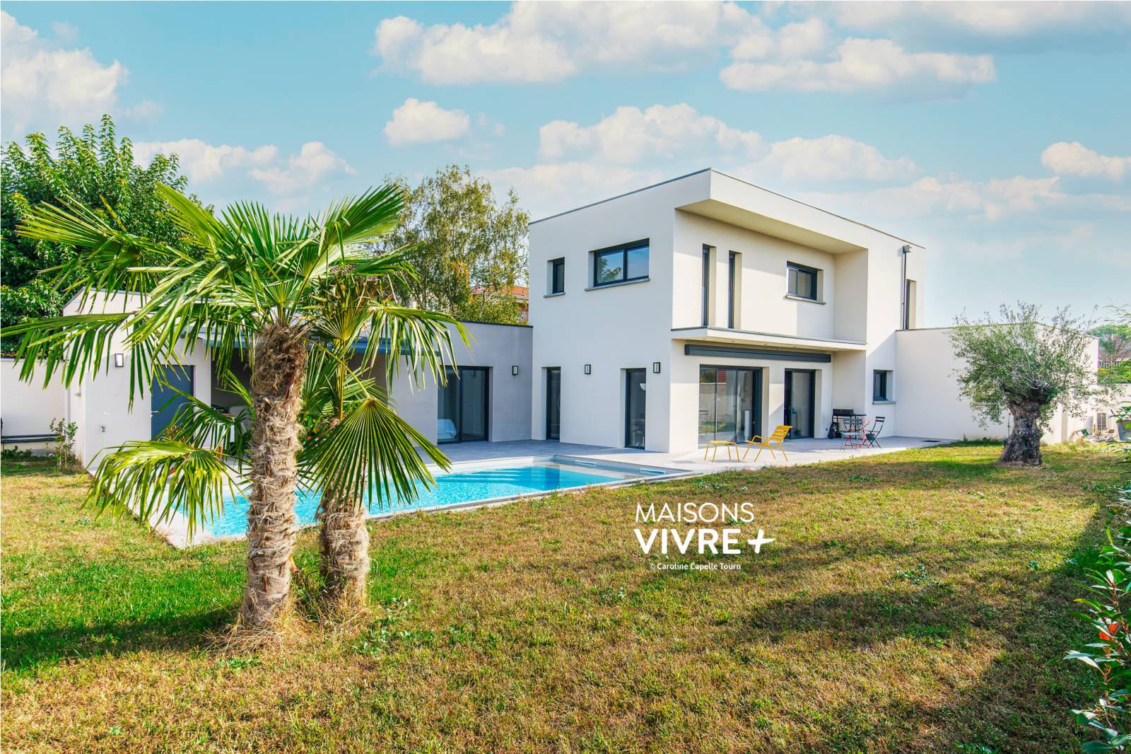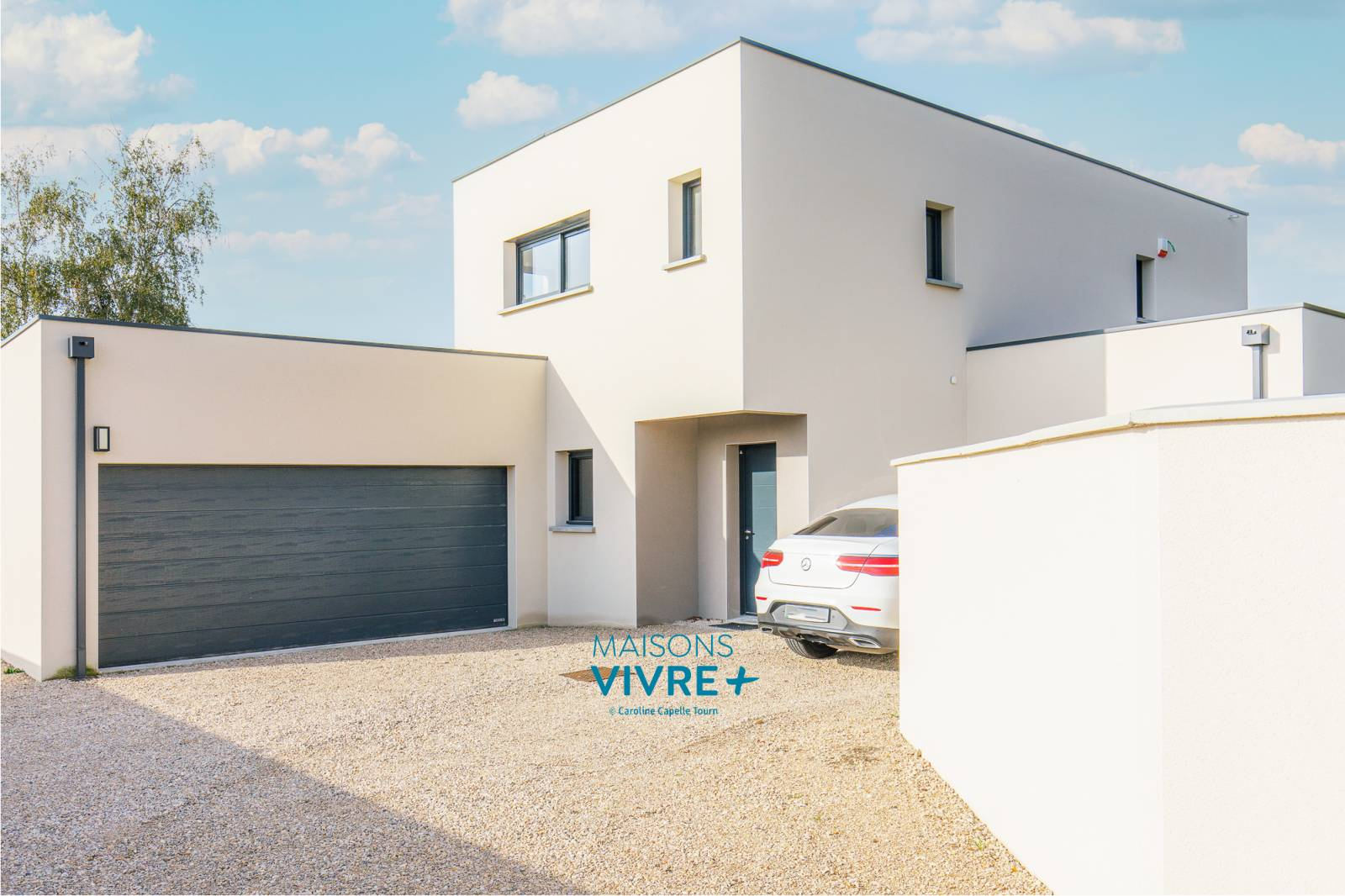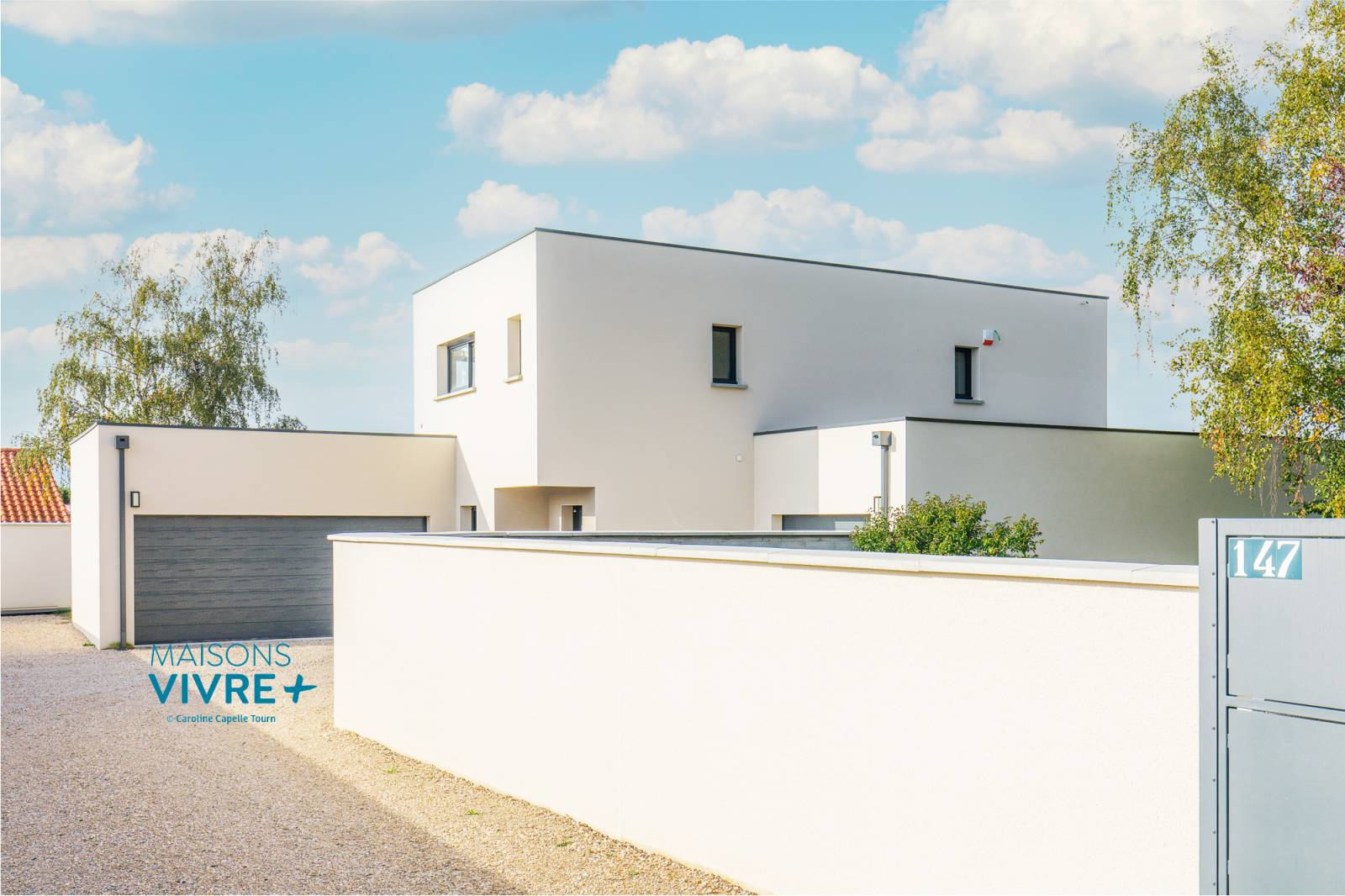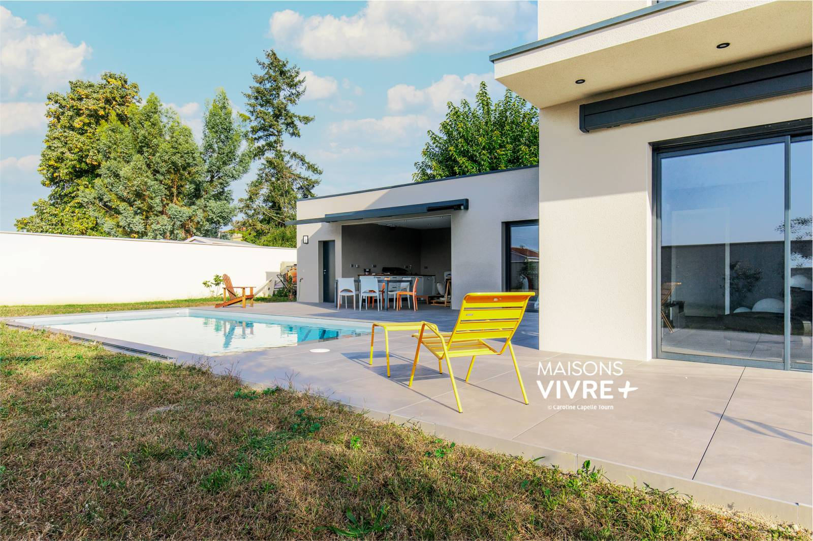 Cette grande maison à étage contemporaine accessible a été construite dans le Rhône, à 10 minutes de Lyon. Elle offre une toiture terrasse, avec de...
