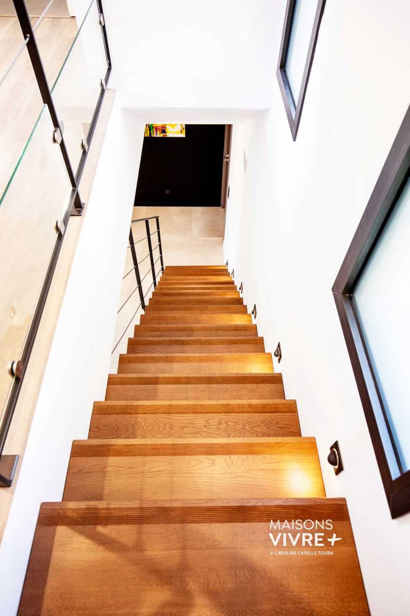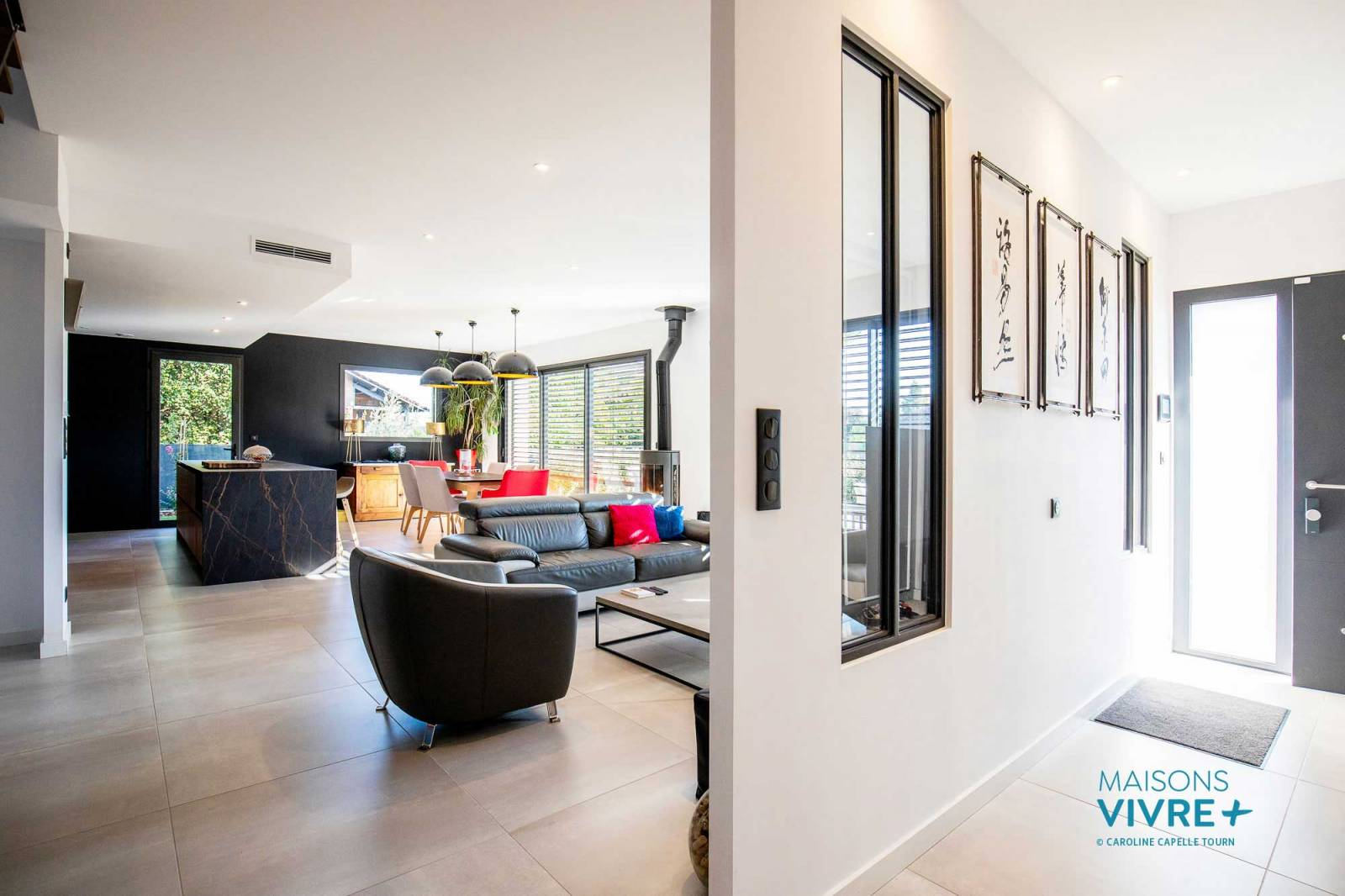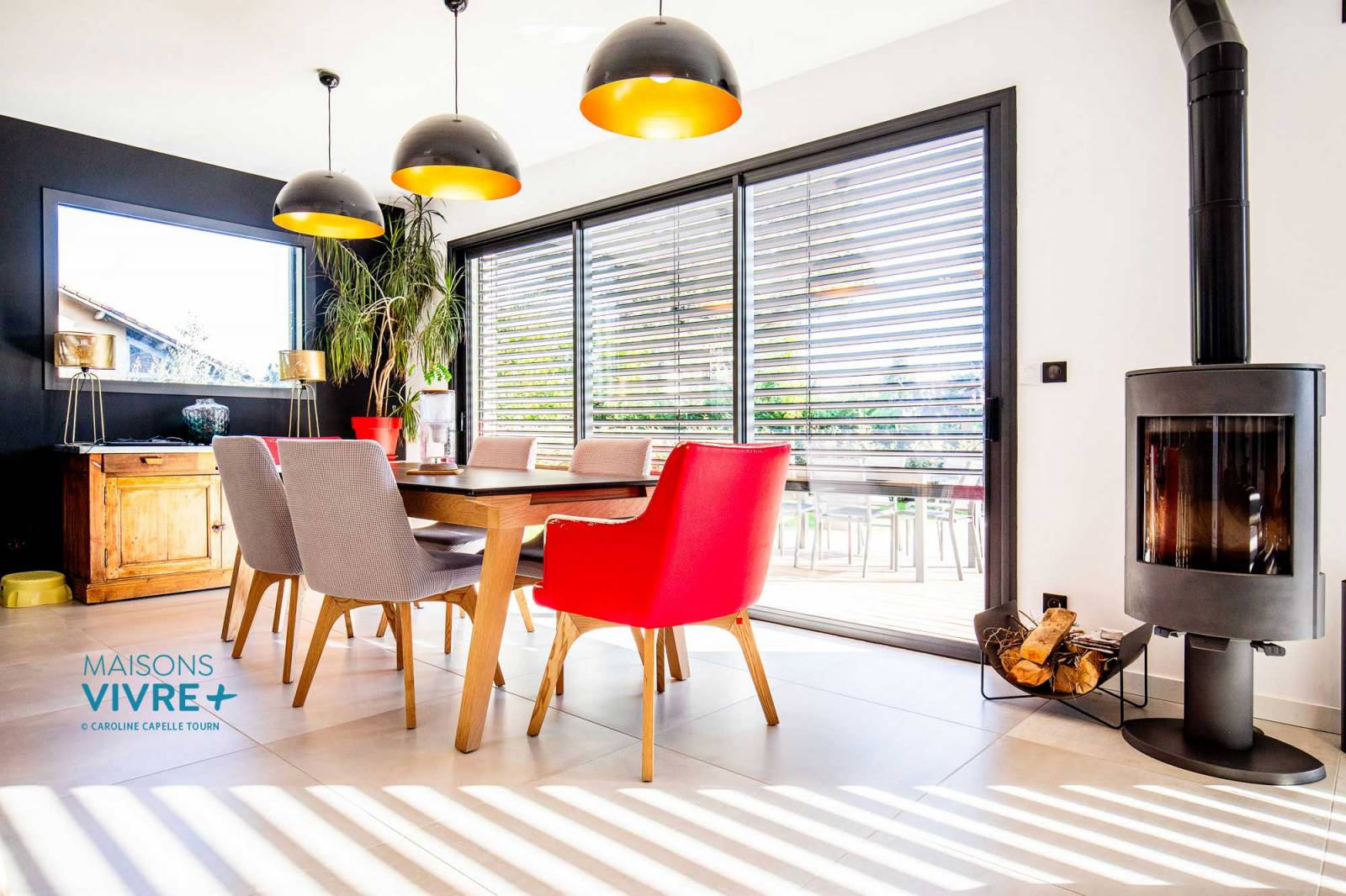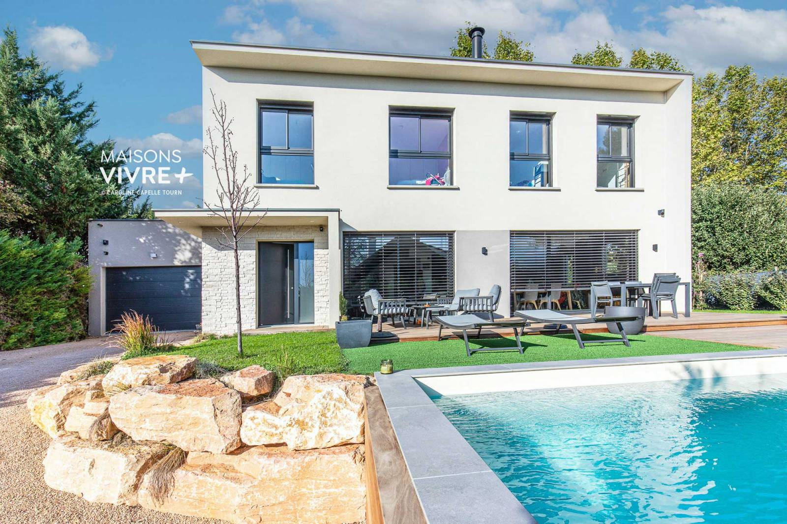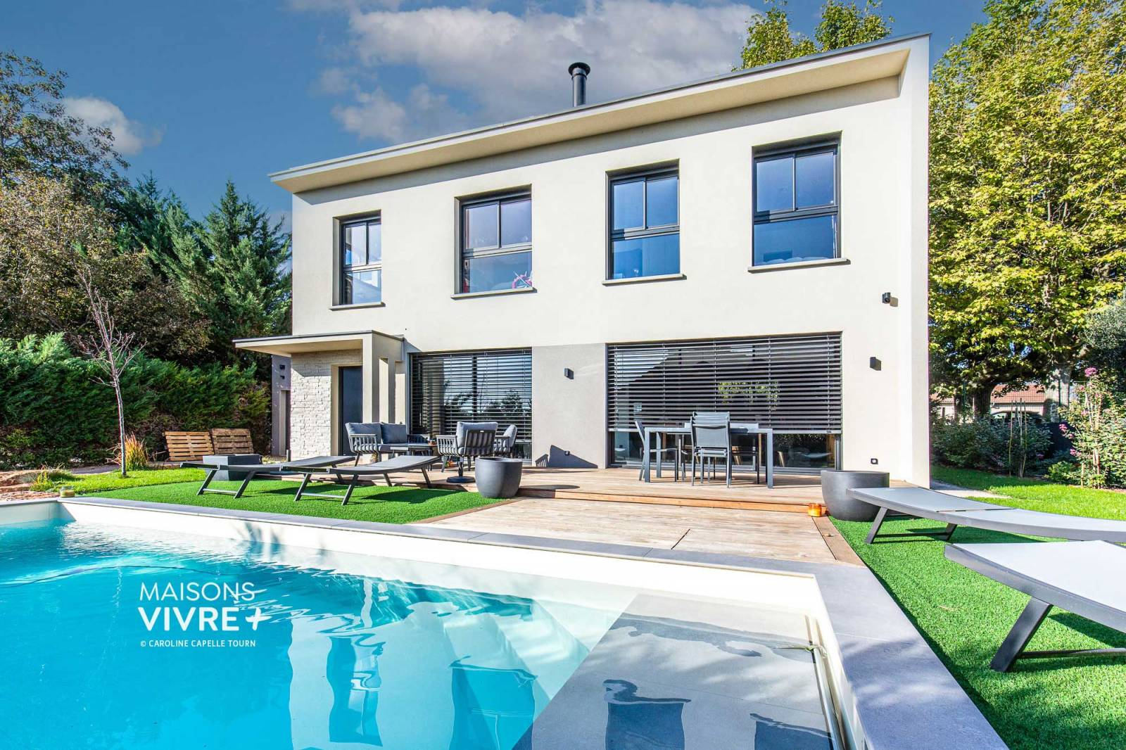 Nous avons construit une belle maison contemporaine en toit terrasse dans un petit lotissement dans le Rhône près de Lyon. Notre équipe a créé un projet de maison qui évoque les codes de l’architecture contemporaine. La maison, construite sur la partie la plus haute du terrain, s’ouvre sur une terrasse et une piscine qui invitent à passer des moments conviviaux. À l’intérieur, un grand salon et séjour profitent de la lumière naturelle et permettent une connexion avec la cuisine ouverte. L’aménagement offre des prestations de haute qualité, avec un sol de grand format, des escaliers en bois, un chauffage au sol et un poêle à bois.