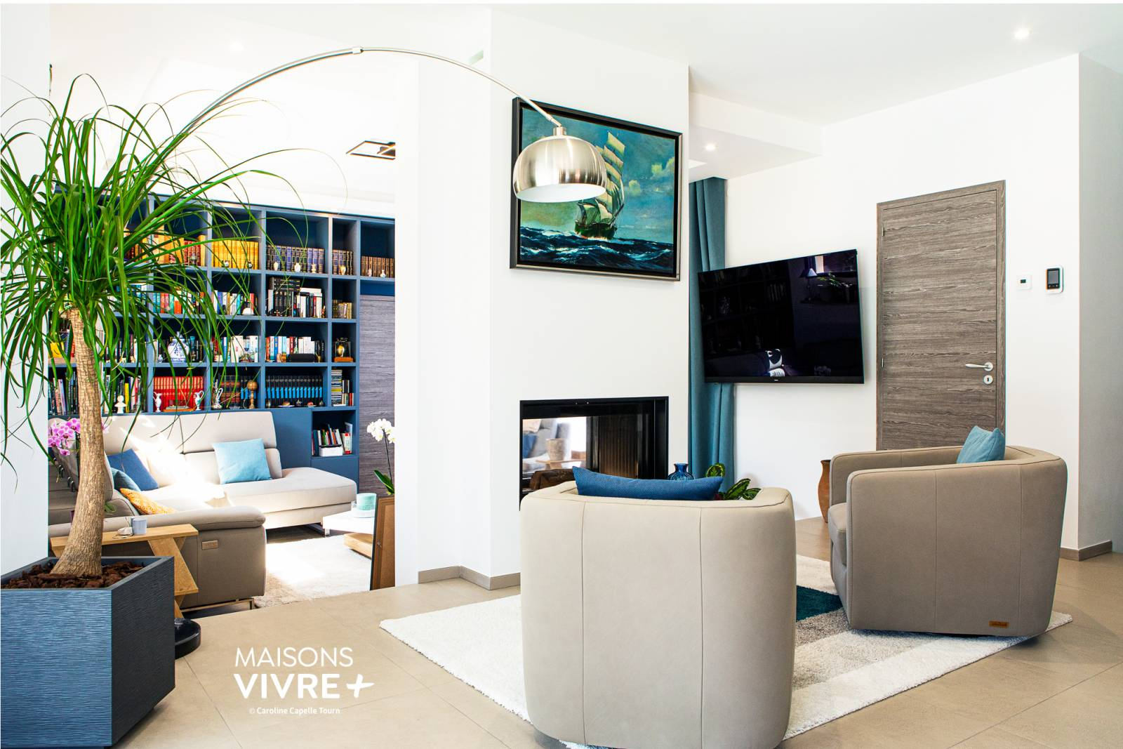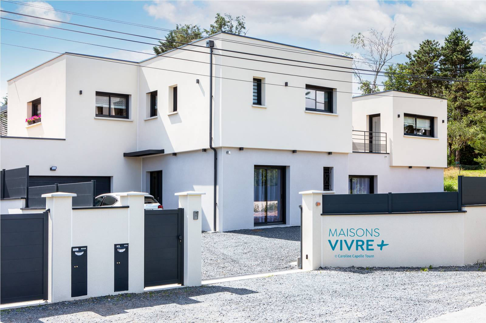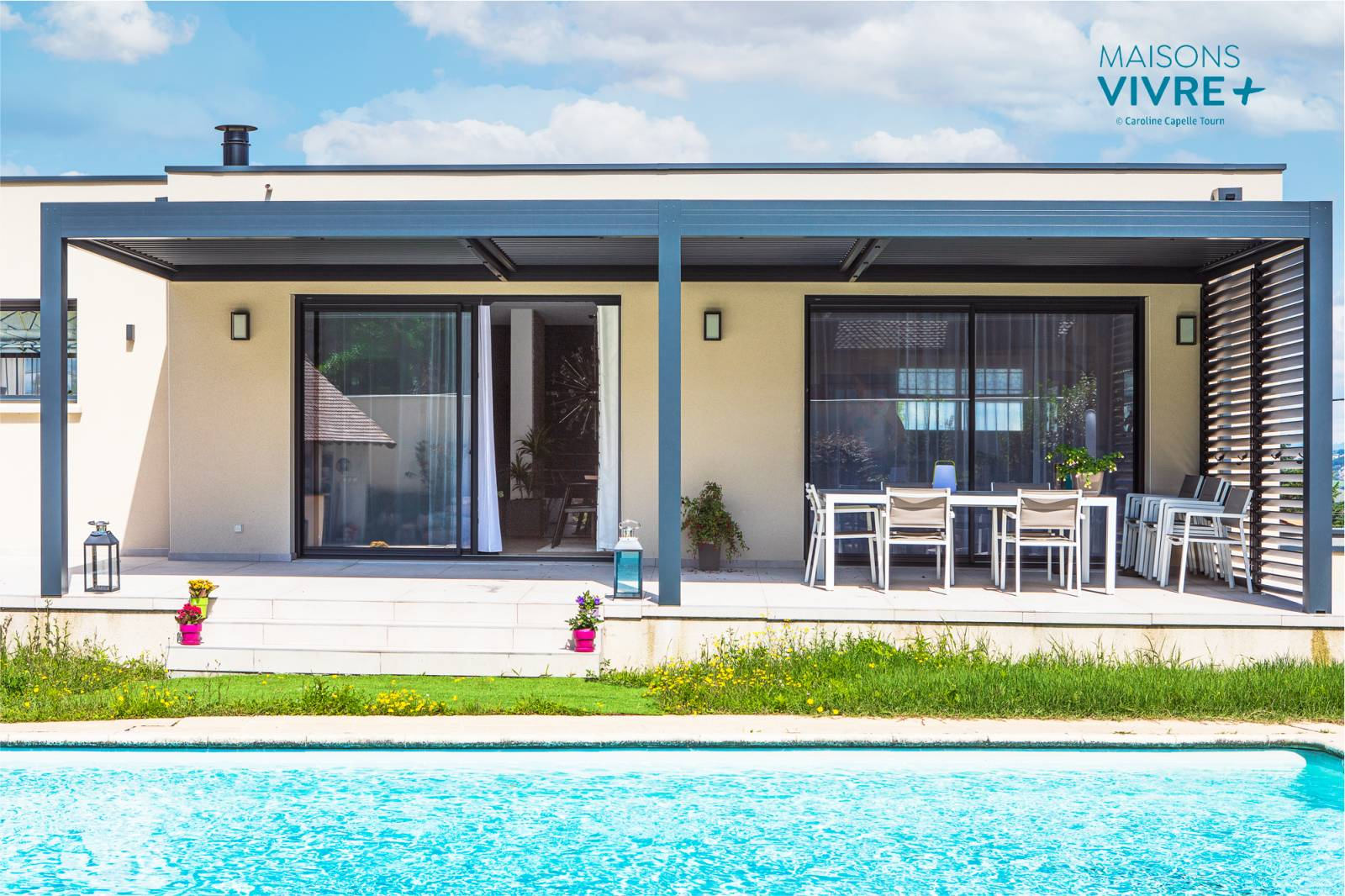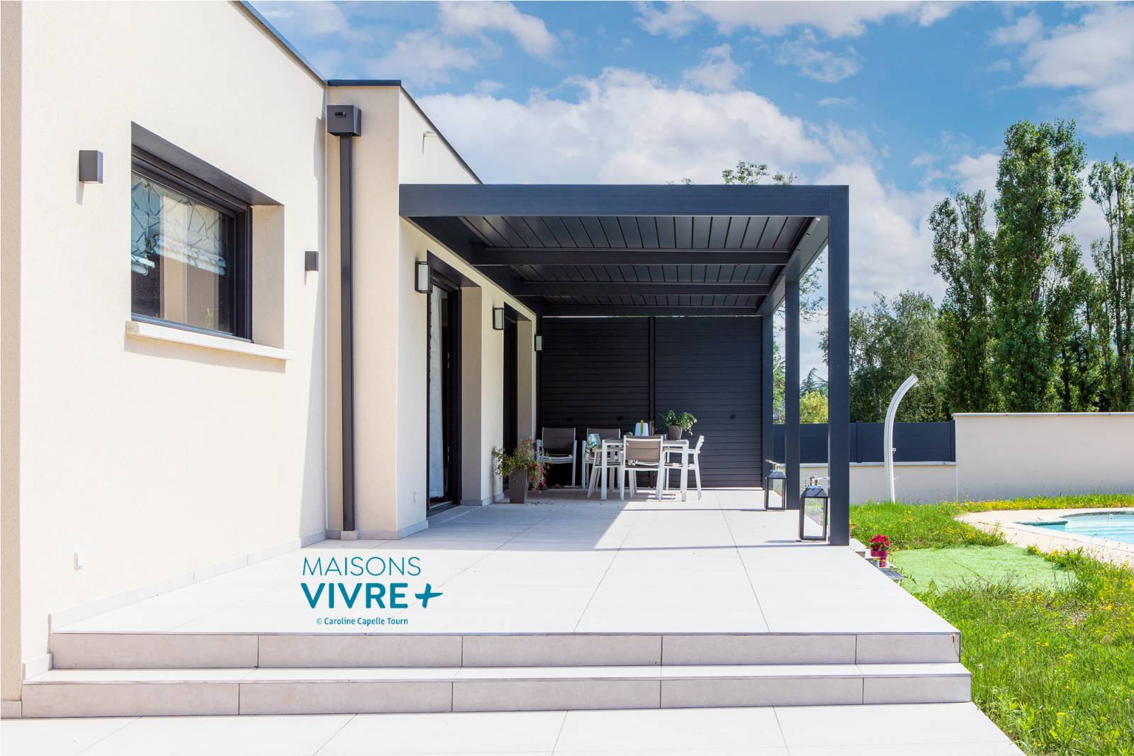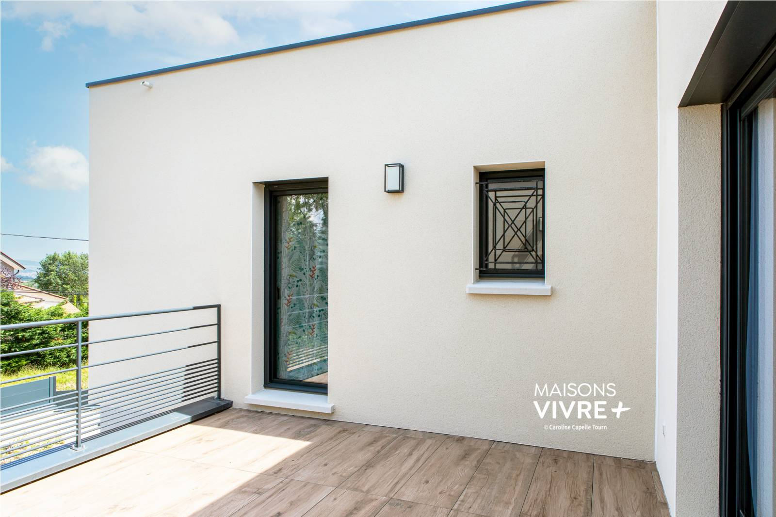 La construction de cette grande maison spacieuse est idéalement située dans le Rhône, aux portes de Lyon. Elle a été construite sur deux étages et dispose d’un grand garage double. Avec une toiture terrasse et ses divers décrochés, cette maison dispose de tous les codes d’une architecture contemporaine. Elle offre à l’intérieur, des espaces de vie confortables remplis de lumière, notamment grâce à de grandes baies vitrées coulissantes. Les menuiseries en aluminium couleur gris anthracite apportent une touche de modernité à l’ensemble de la construction. Côté extérieur, on découvre une terrasse très agréable, ombragée par une pergola design et un coin jardin avec piscine.