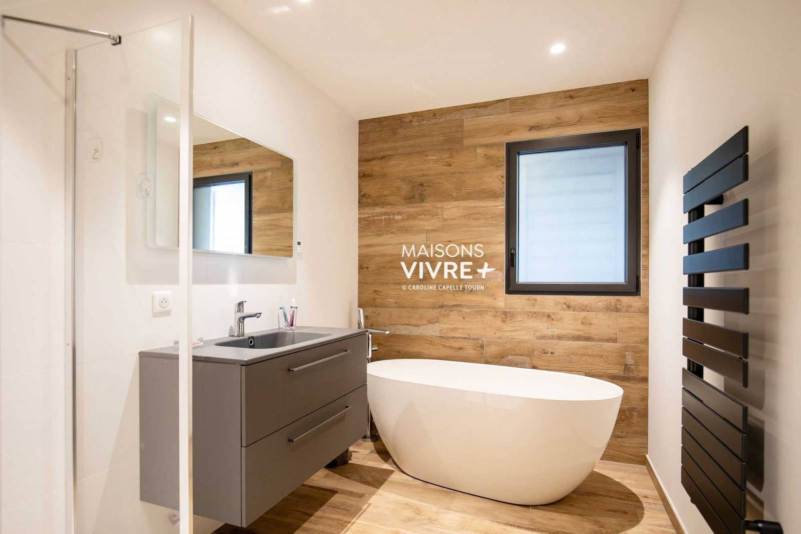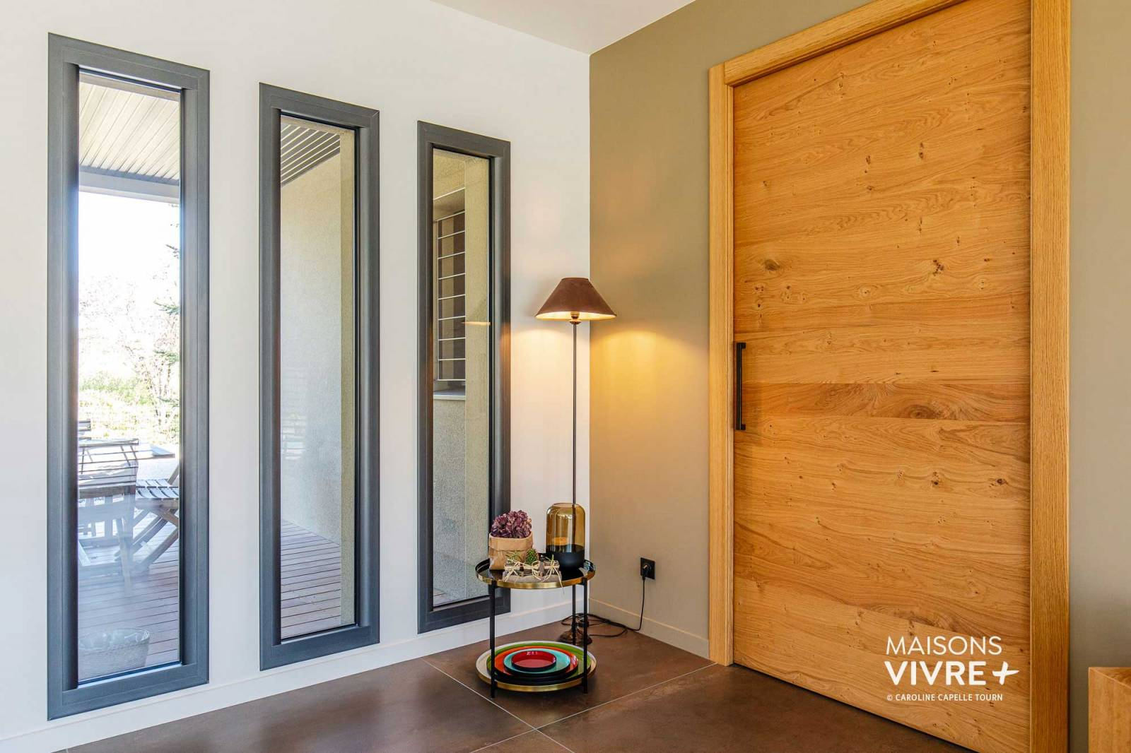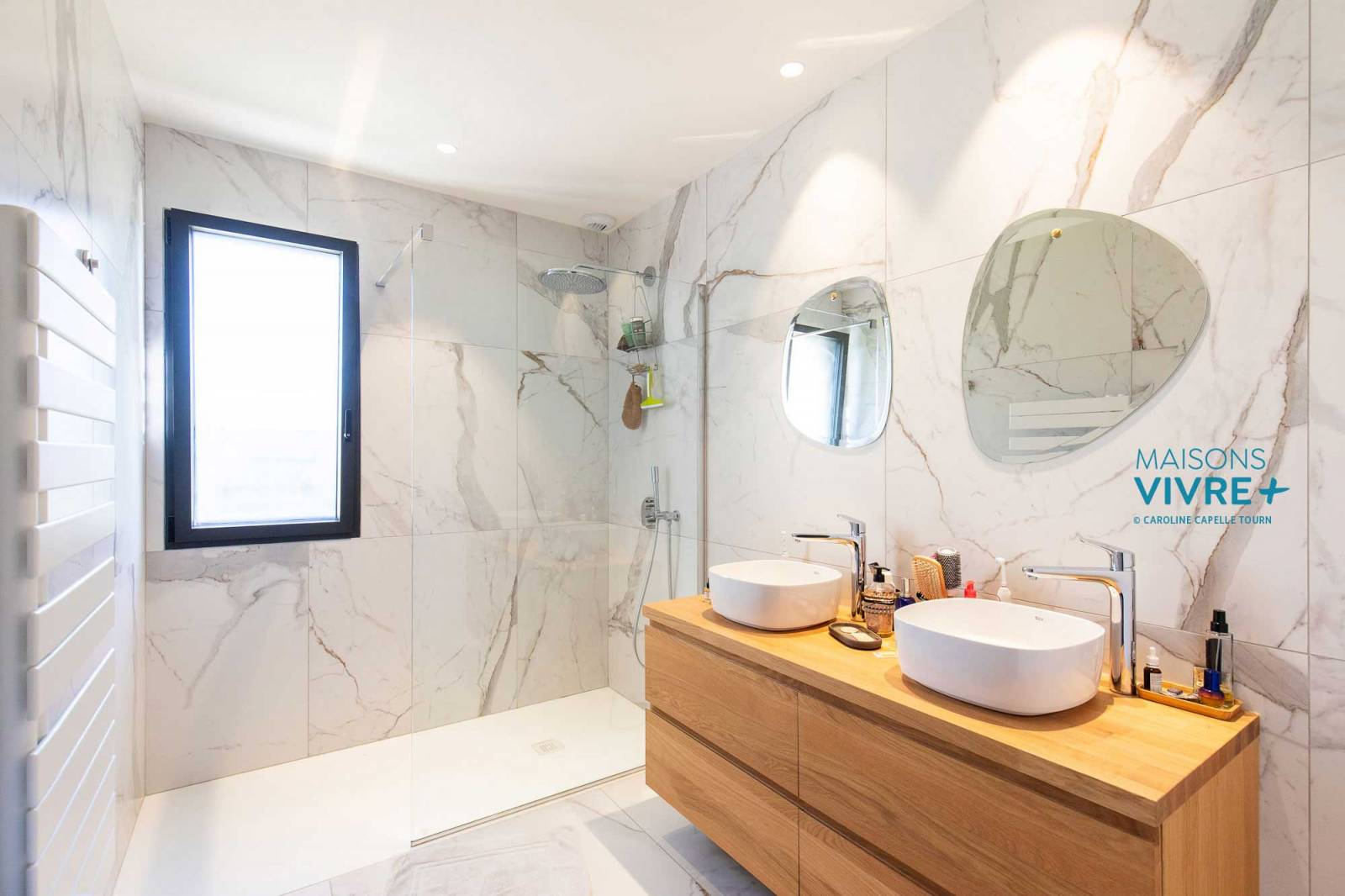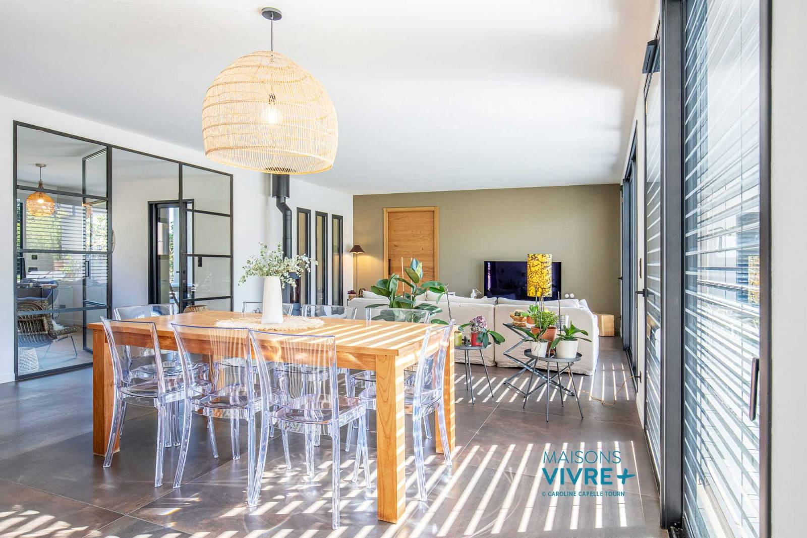 Cette maison à toiture mixte a été construite sur un vaste terrain dans l’Ain. En collaboration avec nos clients, un architecte et notre équipe, nous avons conçu un projet de maison moderne de plain-pied avec des espaces spacieux, lumineux et confortables. Les grandes fenêtres apportent une grande quantité de lumière naturelle aux espaces communs, tout en conférant une touche contemporaine à la maison. Le jardin, accompagné d’une grande piscine située à côté de la terrasse, invite à profiter des journées ensoleillées. À l’intérieur, les finitions de haute qualité, telles que le carrelage de grande dimension et la cloison vitrée, sont mises en valeur grâce à la distribution de l’espace et à la luminosité apportée par les ouvertures de la maison.