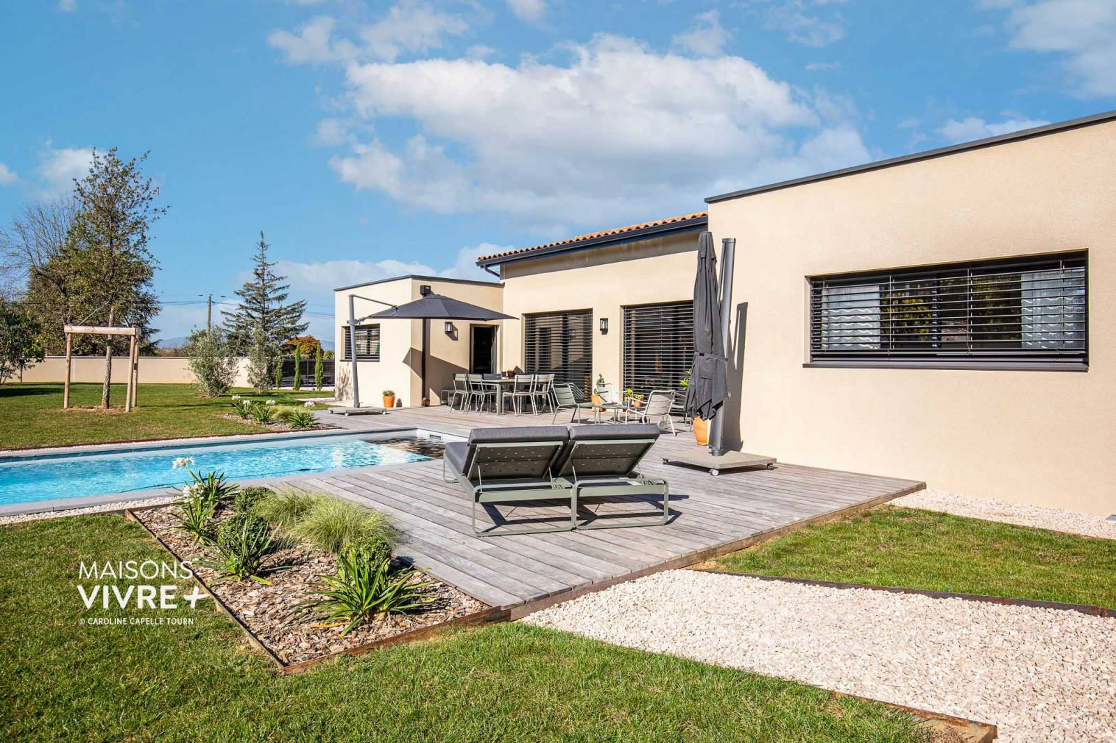 Maison moderne de plain-pied avec toiture mixte, jardin et piscine dans l’Ain : un projet lumineux et haut de gamme